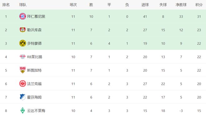 在积分榜上,拜仁牢牢占据榜首位置。拜仁10胜1平保持不败,拿到了31分。勒沃库森赢球之后,总积分达到23分,超越了多特蒙德,升到第2名,但与拜仁的差距依然很大,足足落后8分。多特蒙德以22分排名第3。莱比锡和斯图加特也是22分,排名第4和第5。法兰克福和霍芬海姆都是20分,排名第6和第7。不莱梅以15分排名第8。