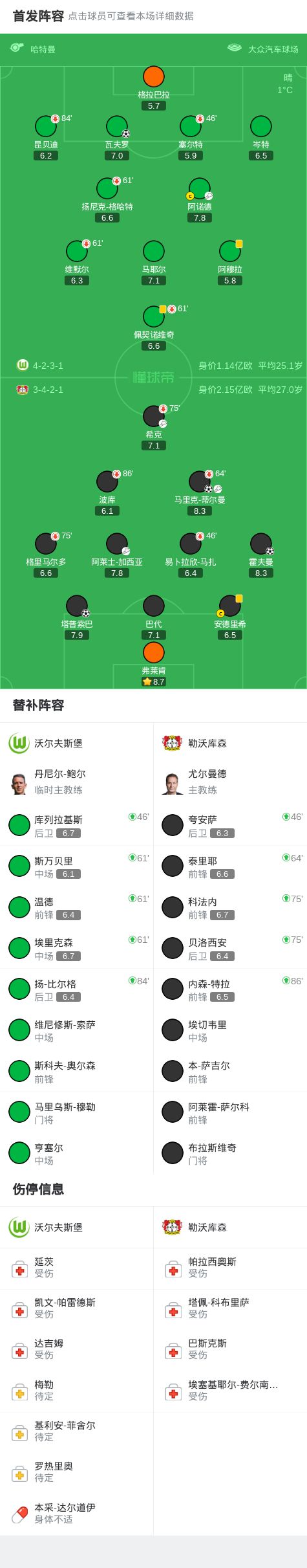 北京时间11月22日德国足球顶级联赛 联赛 第11轮,沃尔夫斯堡主场对阵勒沃库森。上半场霍夫曼后点推射破门先拔头筹,塔普索巴抢点头球破门将比分扩大,马里克-蒂尔曼前插单刀机会低射完成破门。下半场瓦夫罗禁区抢点头球破门扳回一城,随即全场战罢,最终比分勒沃库森在客场3-1沃尔夫斯堡。
