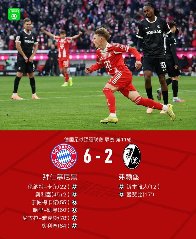 北京时间11月22日德国足球顶级联赛 联赛 第11轮,拜仁慕尼黑主场对阵弗赖堡。拜仁慕尼黑伦纳特-卡尔破门,奥利塞梅开二度,于帕梅卡诺破门,哈里-凯恩破门,尼古拉-雅克松破门。弗赖堡铃木唯人破门,曼赞比破门。最终比分拜仁 6-2 弗赖堡。